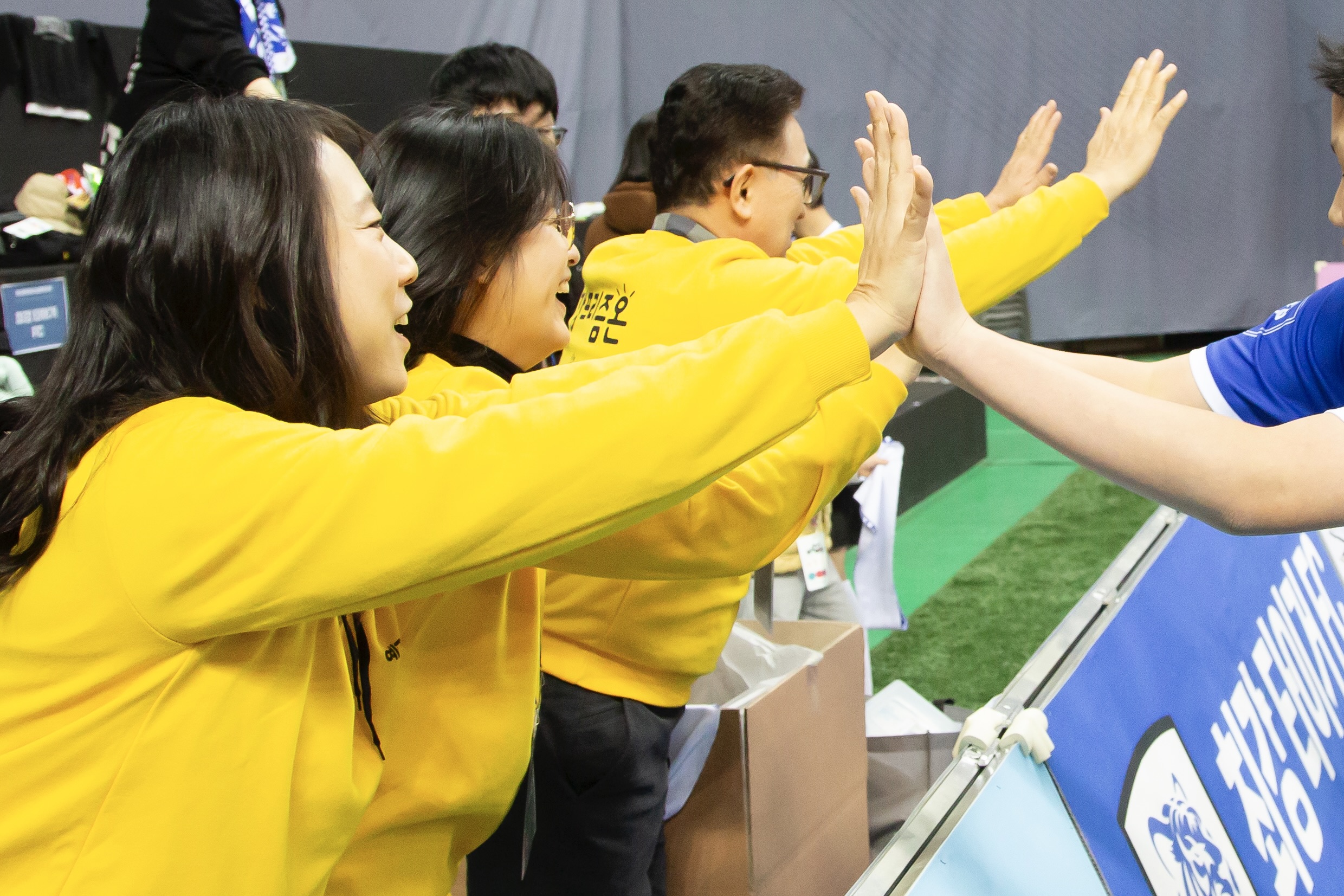 선수들을 맞이하기 위해 넓은 체육관을 각 FC의 컬러와 엠블럼으로 가득 채웠어요.